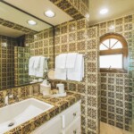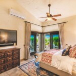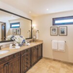 The guest wing features a generous family room with extensive built-in cabinetry, three murphy beds for guest, gorgeous Talavera tilework, a full kitchen and a separate guest bedroom with en-suite bath. The upper level master suite is spacious with sweeping ocean views, a beautiful coral fireplace, dual en-suite baths with intricate tile work and dual walk-in closets with exquisite built-in hardwood cabinetry.