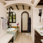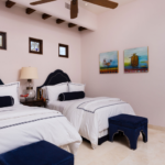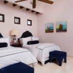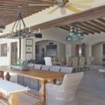 Casa de Karma is a single story, 6 bedroom, 7.5bath estate with indoor and outdoor living space. The great room boasts 15 foot beamed ceilings, a large stone fireplace, and an 80 inch TV for your viewing pleasure. The professional culinary kitchen is very spacious and well equipped and has an adjoining chef’s kitchen for prepping or seamless entertaining. Right off the kitchen is the dining area that accommodates 14 or you can also enjoy outdoor dining on the pool patio accommodating 18.